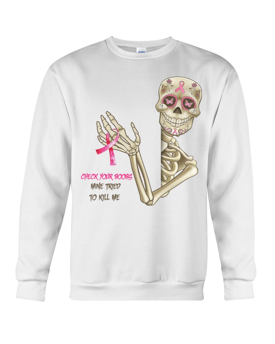 Breast Cancer Awareness Skeleton Check Your Boobs Mine Tried To Kill Me shirt, hoodie